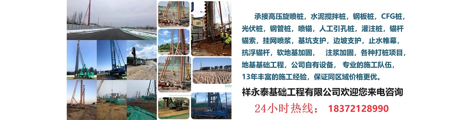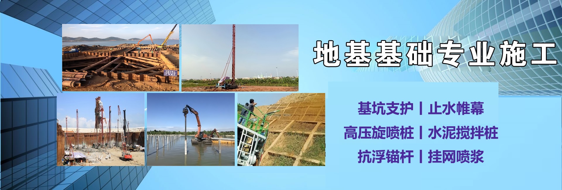 高壓旋噴樁施工 水泥攪拌樁施工 三軸攪拌樁施工 注漿加固 錨桿錨索施工 鋼板樁施工 光伏樁施工 CFG樁施工 掛網噴錨施工 基坑支護 鋼管樁施工
